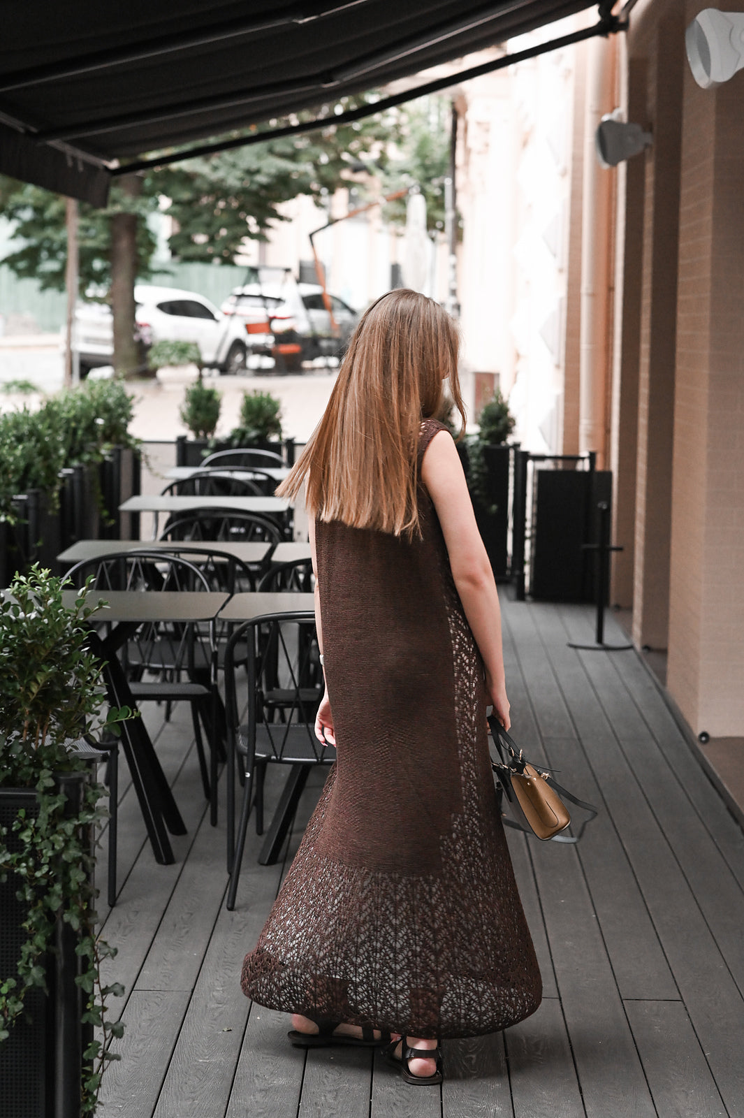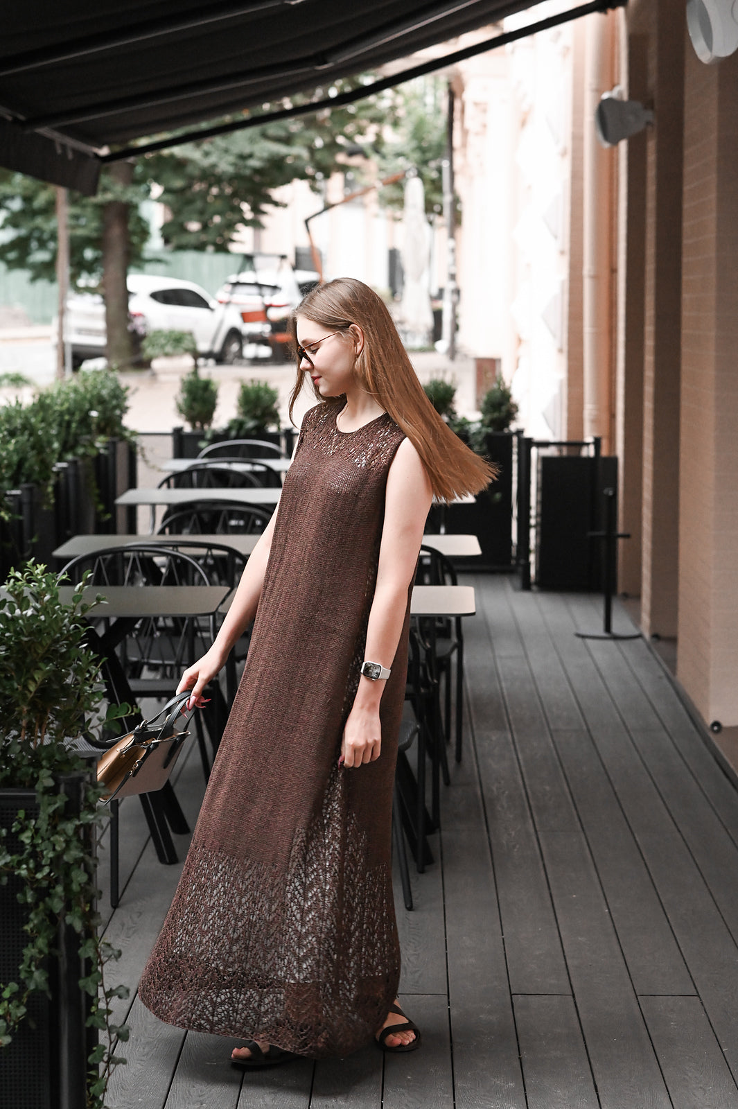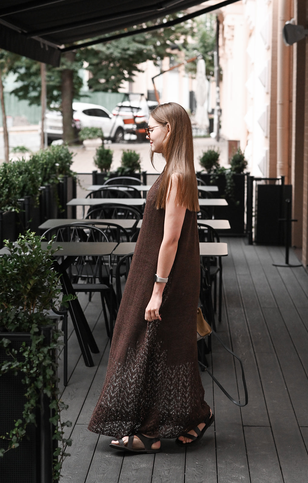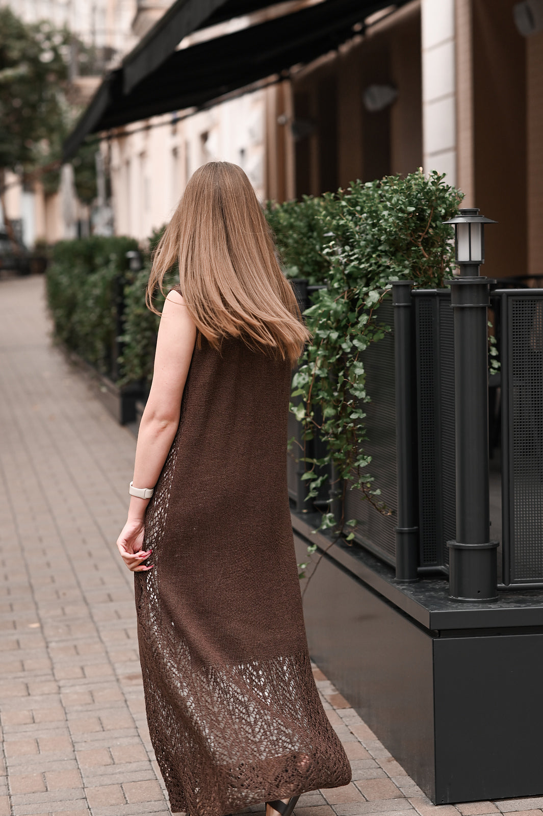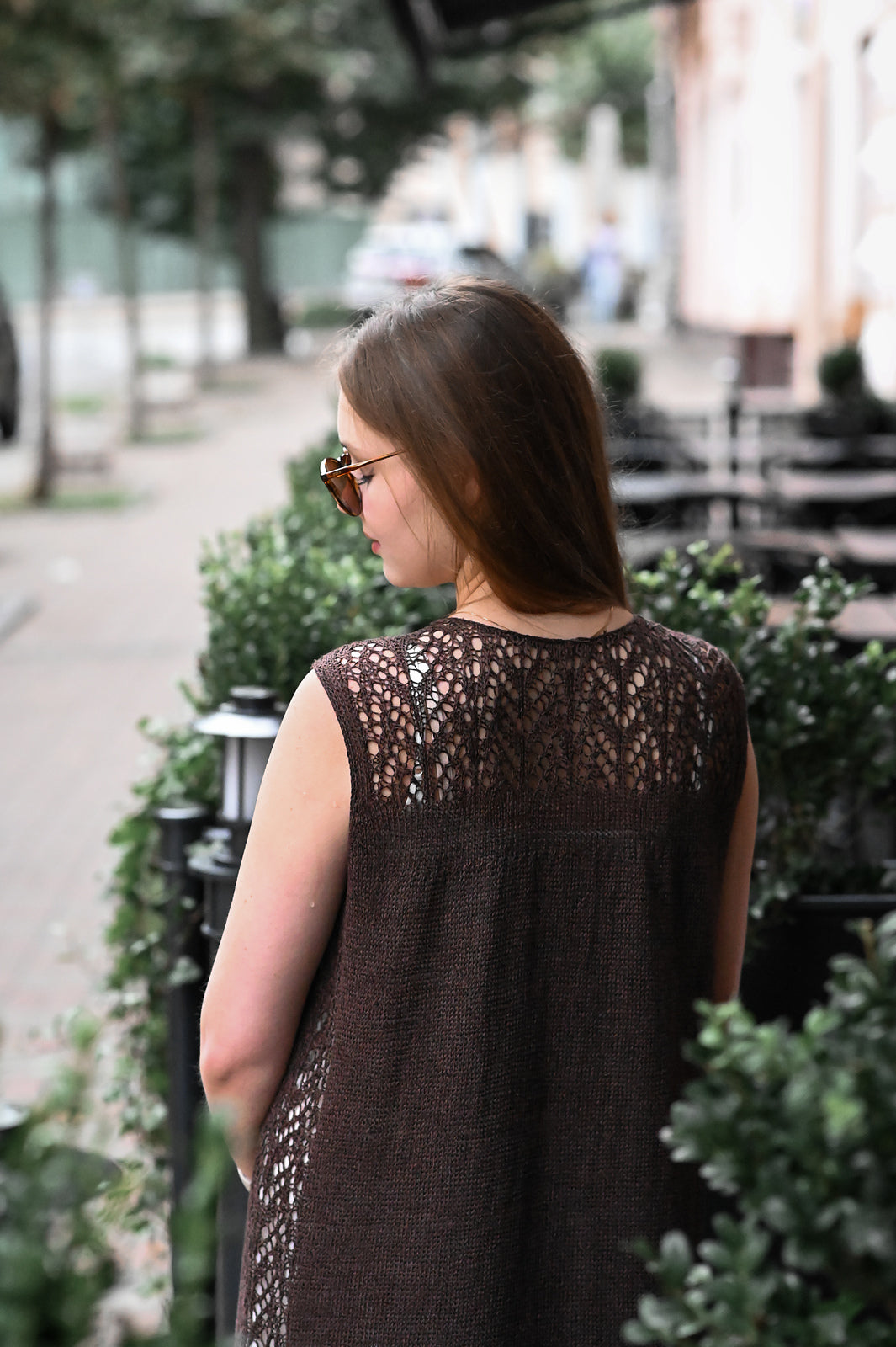 Сукня Avalynn в’яжеться знизу вгору однією деталлю по колу. На рівні пройми робота поділяється на перед і спинку, які закінчуються окремо, плечові шви з’єднуються методом закриття петель трьома спицями.