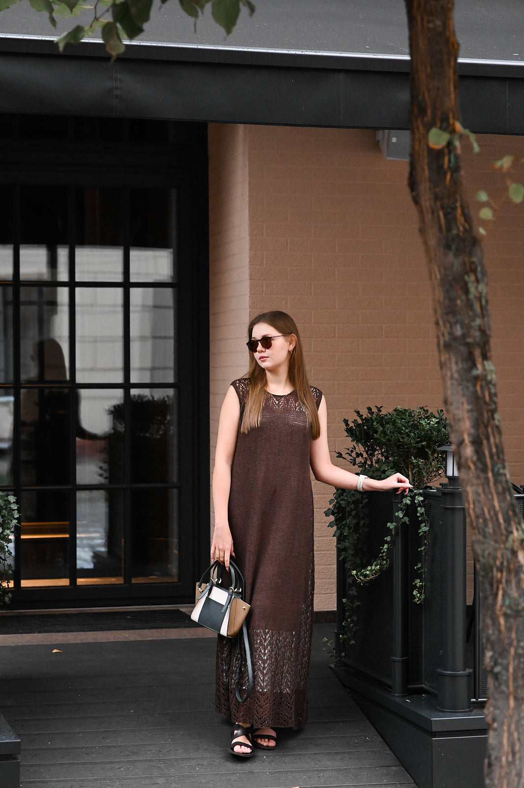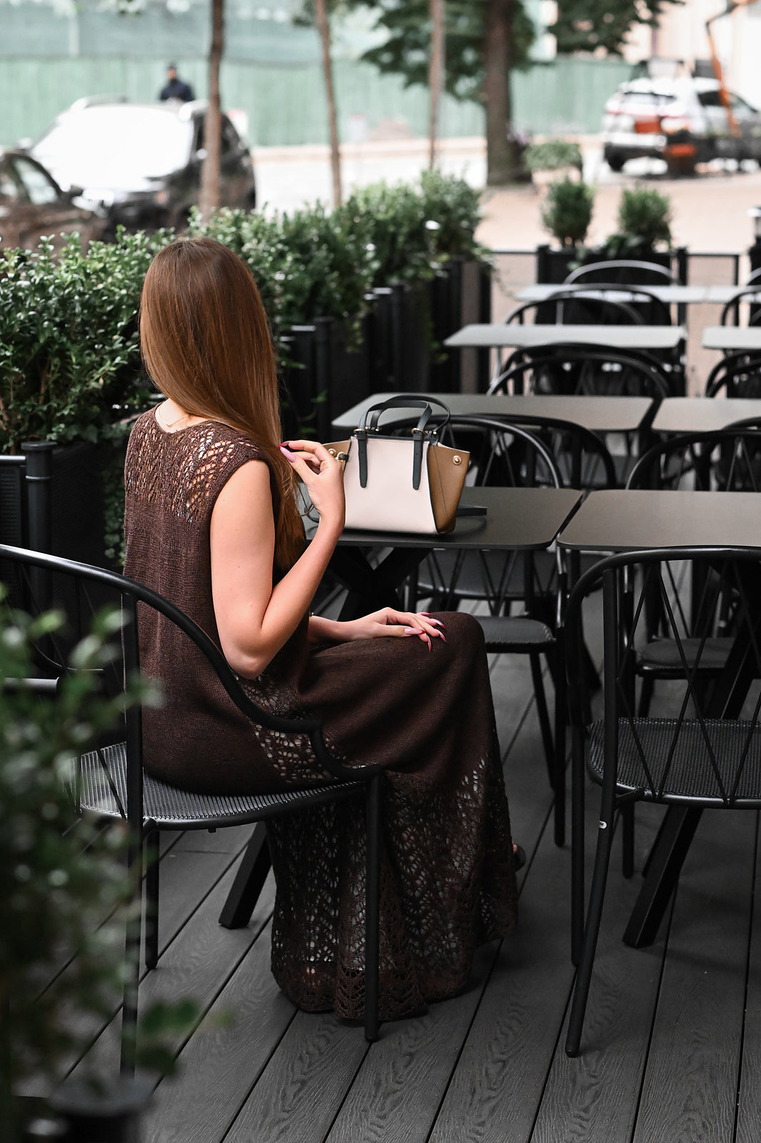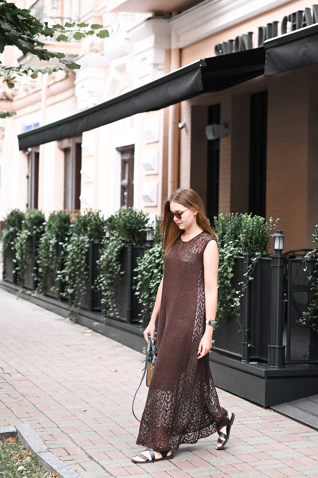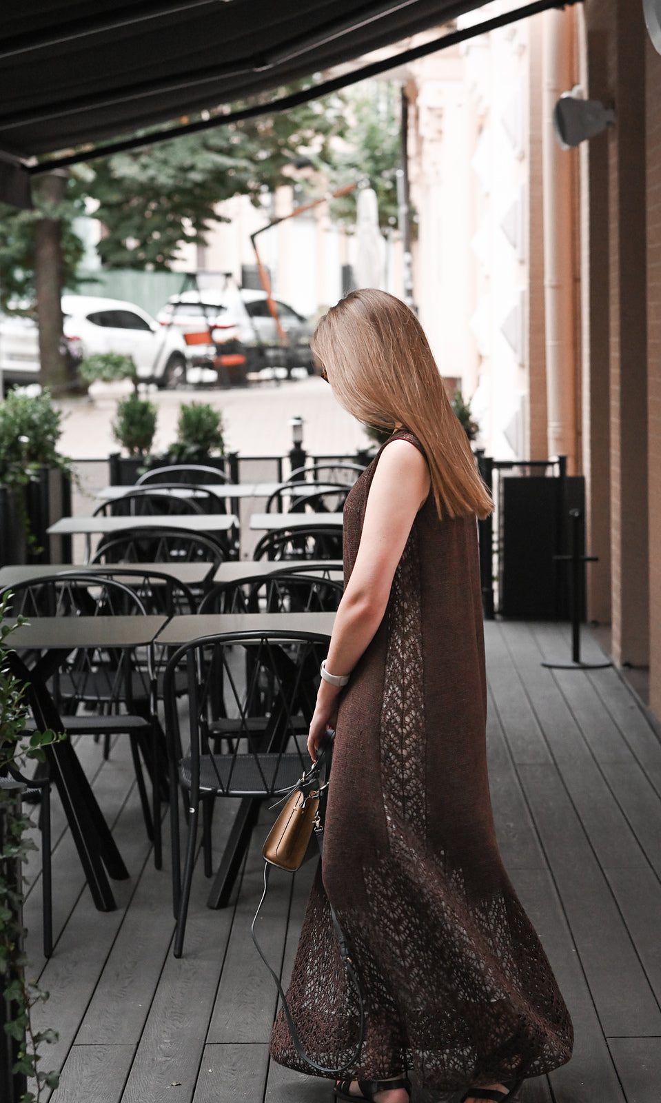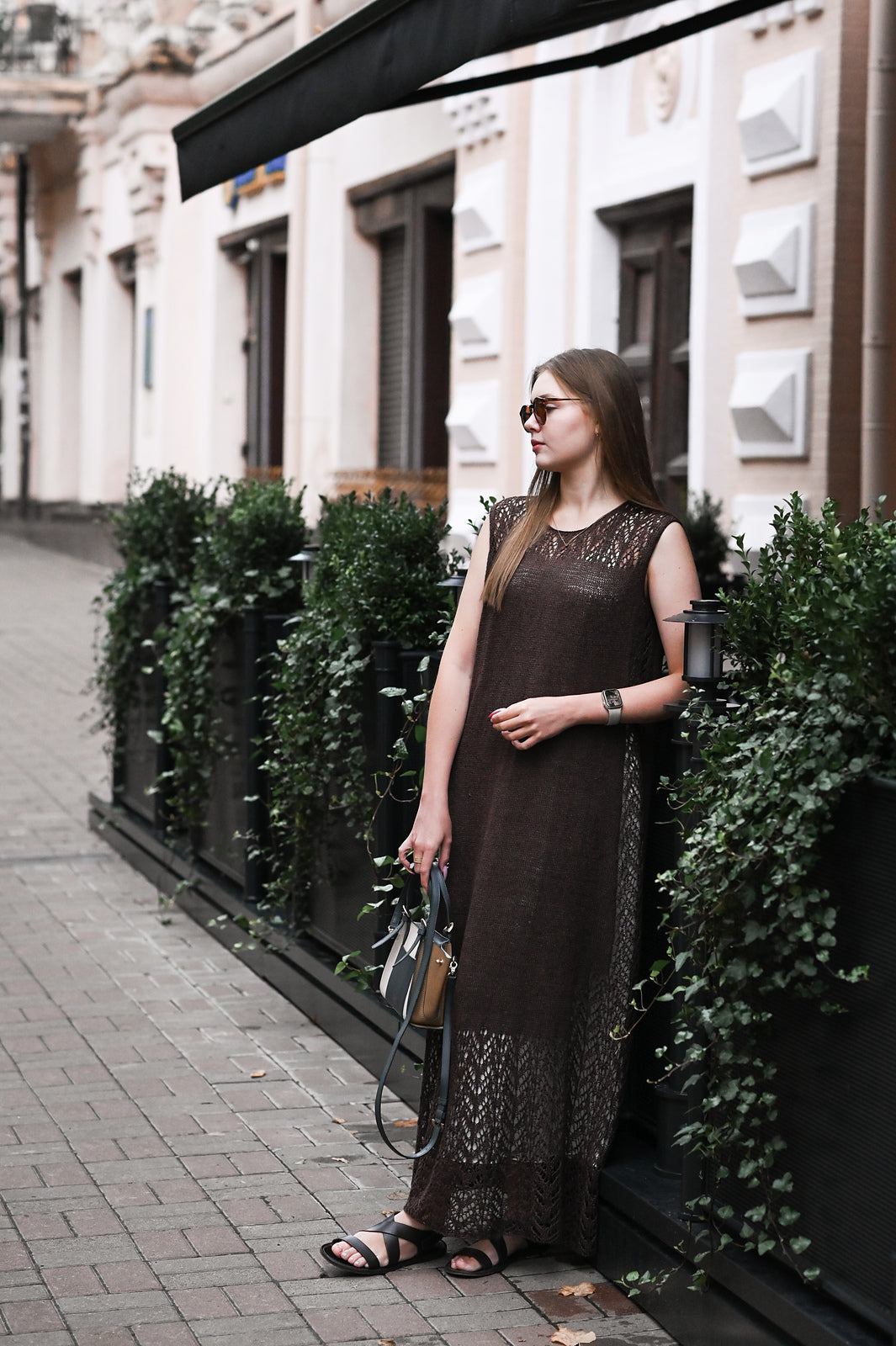 Сукня Avalynn в’яжеться знизу вгору однією деталлю по колу. На рівні пройми робота поділяється на перед і спинку, які закінчуються окремо, плечові шви з’єднуються методом закриття петель трьома спицями.